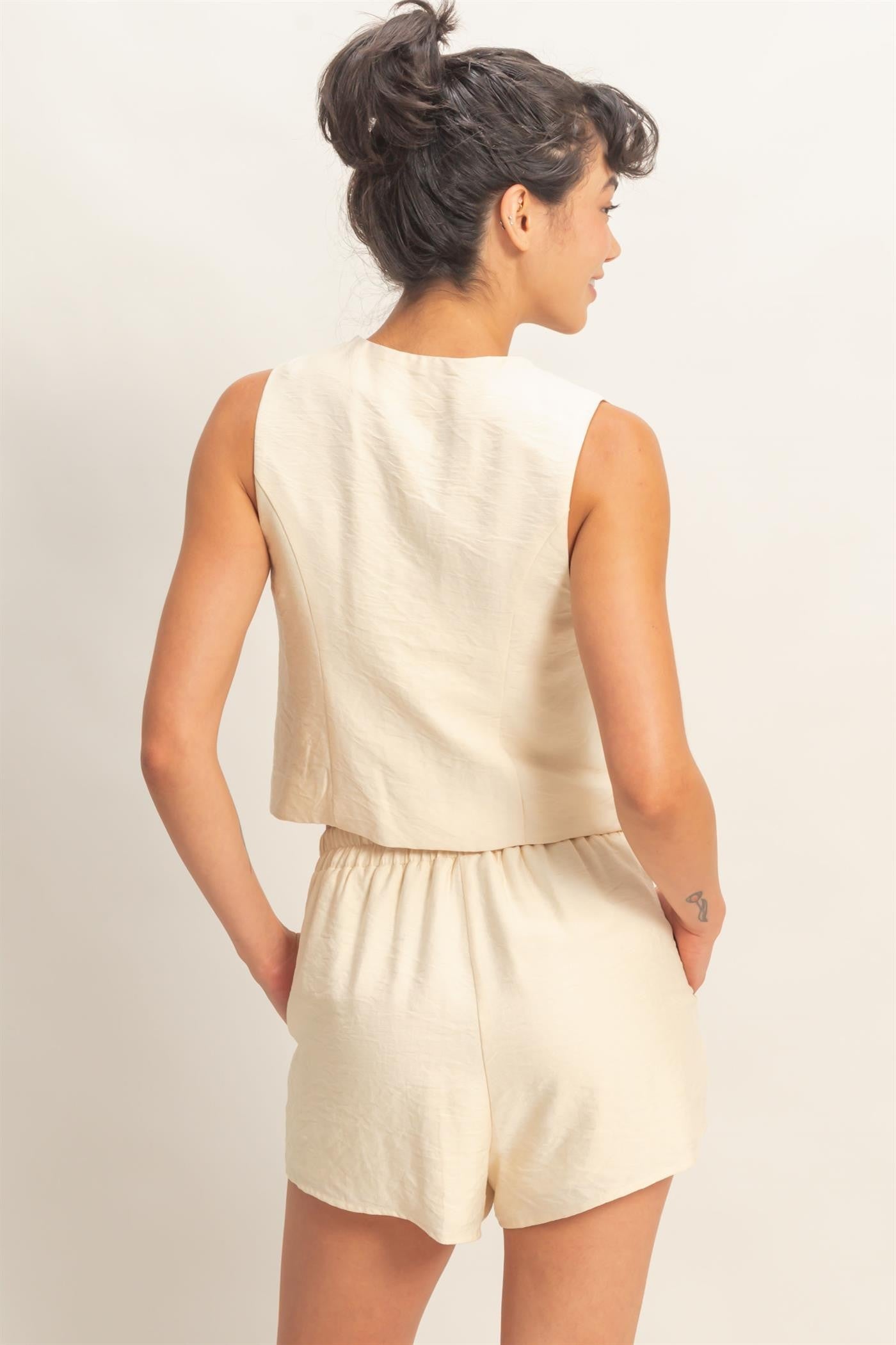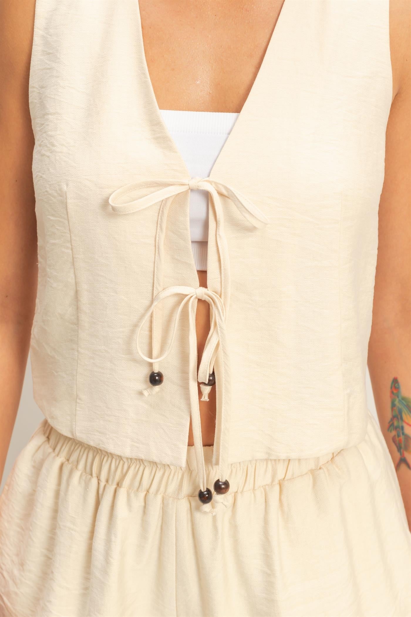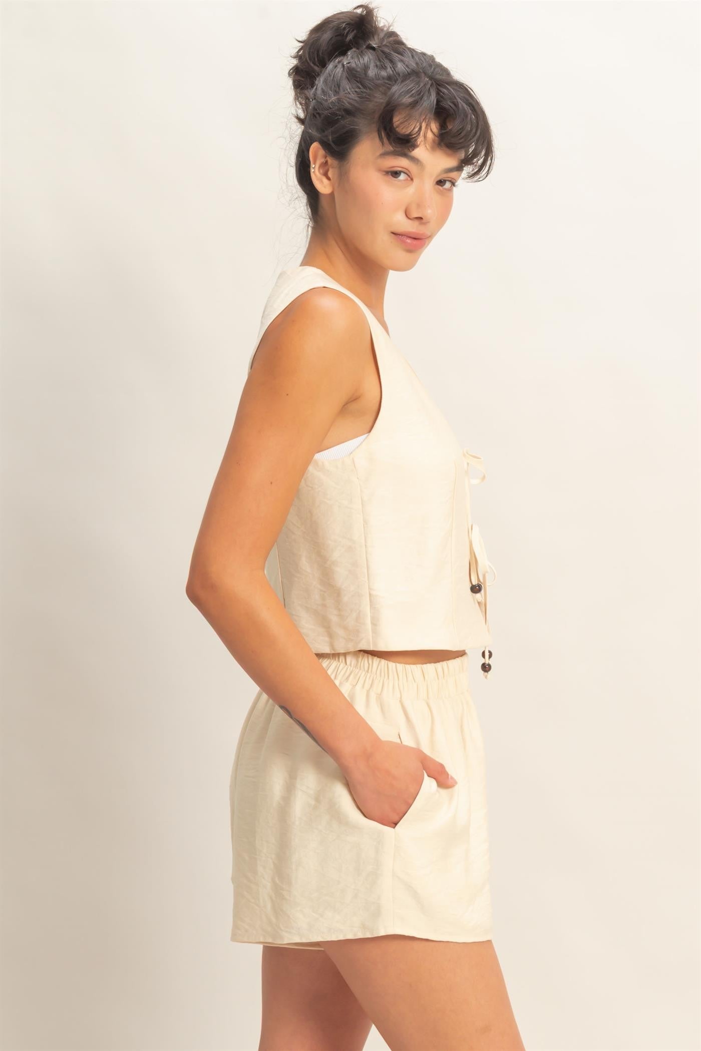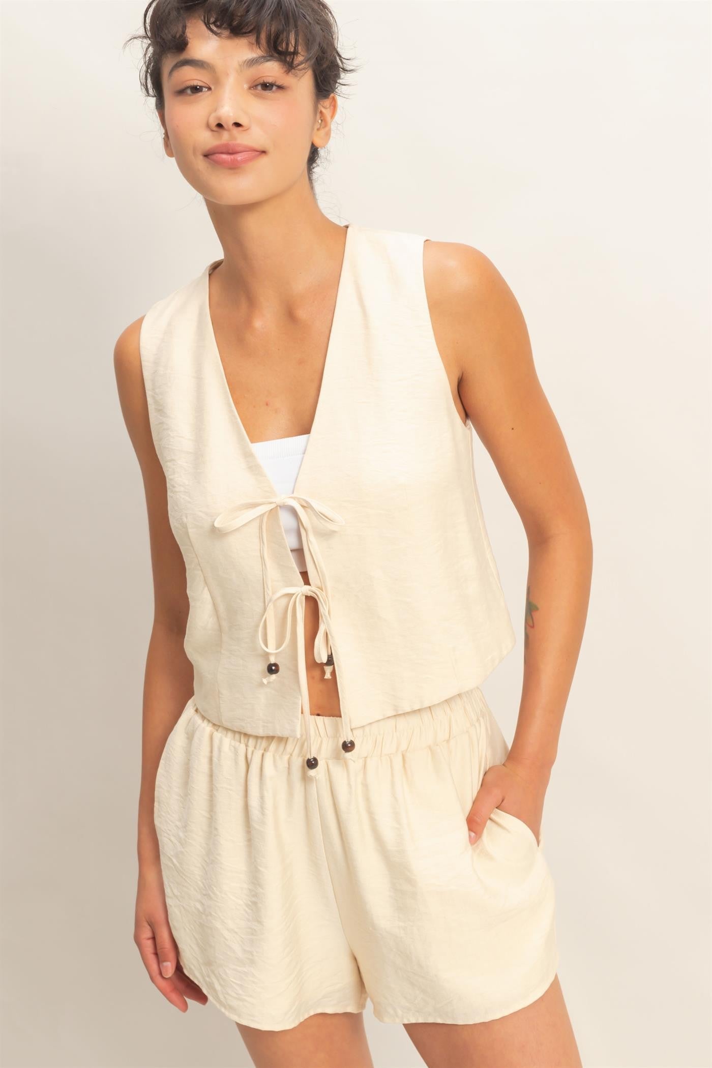 Light, effortless, and made for easy days, this set is your go-to for relaxed, elevated style. Featuring a breezy sleeveless vest with a flattering V-neckline and delicate front tie closures, paired with matching high-rise elastic waist shorts for all-day comfort.